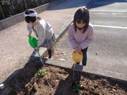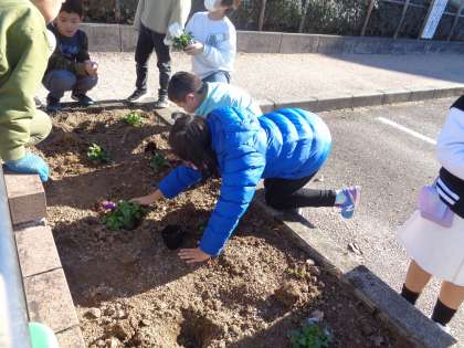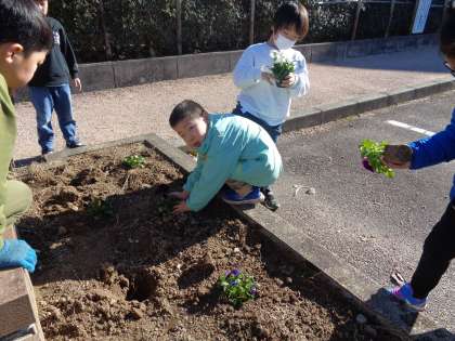 2年生は、花の苗植えを行いました。大きく育って欲しいという願いを込めて植え、水をあげていました。これまでの、苗を植えた経験を生かして取り組むことができました。