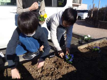 今日は、苗を植えました。児童玄関前のプランターに植えています。学校に彩りが増え、満足した様子でした。
