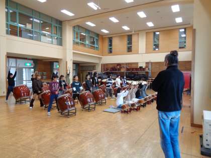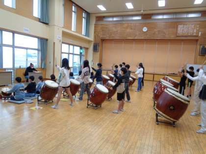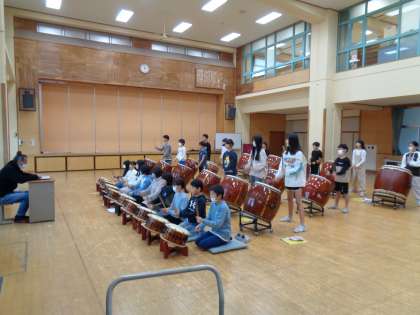 太鼓をたたく時の姿勢やばちの構え方、正確なリズム等を丁寧に確認しました。