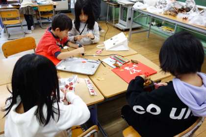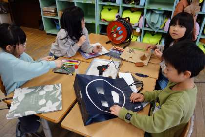 リース作りで余った材料を使い、お面づくりを楽しみました。思い思いのお面をつくり、楽しい時間を過ごしました。