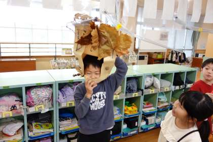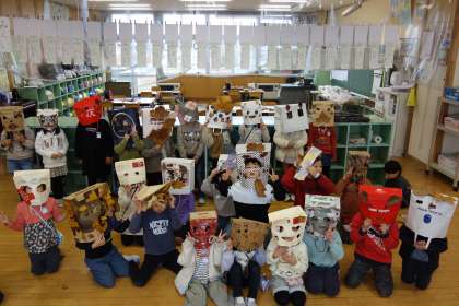 できたお面をかぶって、集合写真も撮りました♪