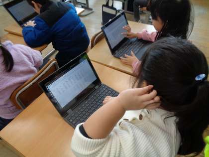 クロムブックを使った学習では、ローマ字表を見ながらひらがな表をつくりました。学年が上がった時に、クロムブックを使って調べ学習をしたり、友達と考えを共有したりできるように、たくさんクロムブックを使ってクロムブックに慣れていきます。また、分からないことがあったときには助け合うことができるようにペアで学習を行っています。