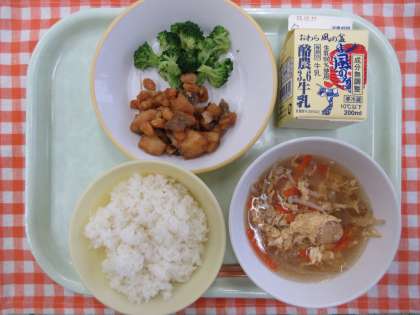 今日の献立は、ご飯、魚と大豆のネギソースからめ、ゆでブロッコリー、中華かきたま汁、牛乳です。