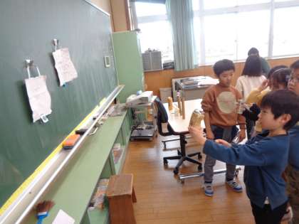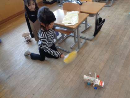 今日は、生活科で作ったおもちゃで遊びました。友達の作ったおもちゃの工夫を知り、驚いたり、自分のおもちゃに生かそうとする姿が見られました。様々なおもちゃで楽しく遊ぶことができました。