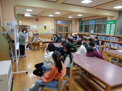 図書館司書の先生にクリスマスに関する本の紹介をしていただきました。子供たちは真剣にお話を聞いていました。また、冬休み用の本の貸出を行いました。休み中も本に親しみましょう。