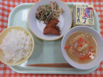 今日の献立は、ごはん、豚肉のかおり揚げ、梅肉和え、みそ汁、牛乳です。
