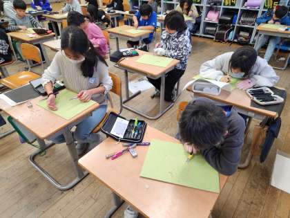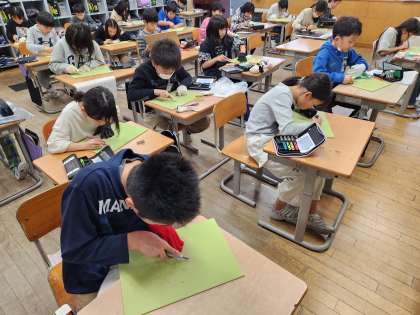カーボン紙を使って下絵を板に写し、彫刻刀で彫っています。