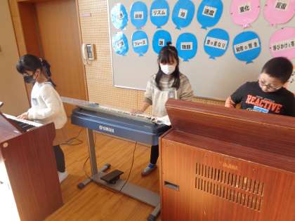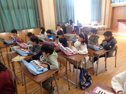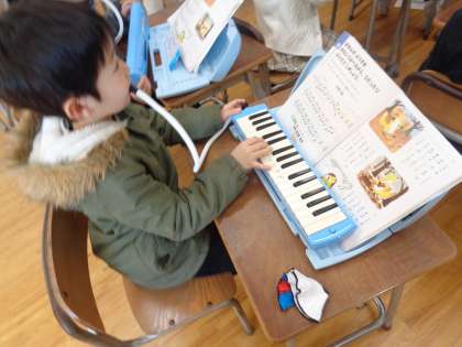 今日は、ピアノと鍵盤ハーモニカで「小ぎつね」の演奏を行いました。友達の演奏を聴いて、合わせながら弾くことができています。