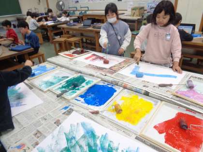 今日は版画の学習を行いました。ローラーで何度も色を重ねることを楽しみながら活動に取り組むことができました。鮮やかな色になるように何度も色を重ねていました。