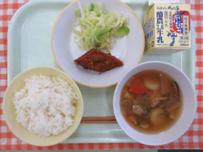 今日の献立は、ごはん、魚のえごまだれ、ゆでキャベツ、すいとん、牛乳です。
