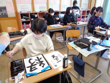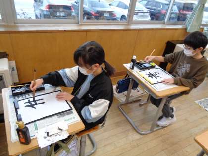 2024年をどのような一年にしたいか考え、漢字一文字で書きました。たくさん「笑」う年にしたい、目標を達成できるように「努」力する年にしたいなど、一人一人の思いがこもった作品が仕上がりました。