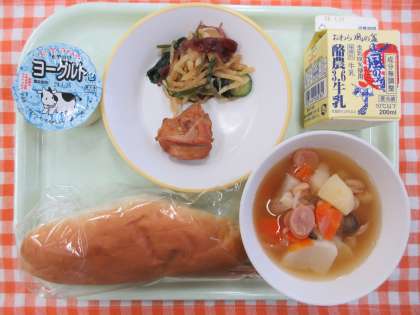 今日の献立は、米粉コッペパン、照り焼きチキン、海藻サラダ、豆ときのこのスープ煮、ヨーグルト、牛乳です。