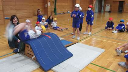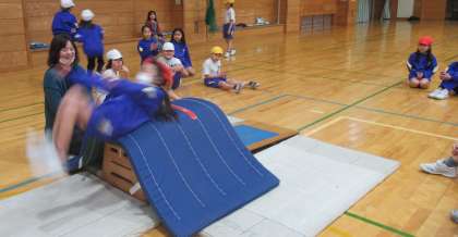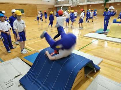 今日は、台上前転に挑戦しました。はじめは「こわい〜」と言っていた子供たちも、意識するポイントを伝え、「先生がいるから大丈夫だよ」と励ますと、安心して思い切り練習に取り組むことができました。学習の途中で、「できた」と喜ぶ子供の声がたくさん聞かれました。これからも、子供たちが、できるようになる喜びを感じることのできる授業を目指します。