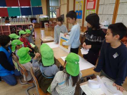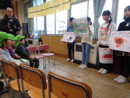 今日は、水みらいプロジェクトの締めくくりとして、宮野保育所の年長児に合場側の水辺生物について発表をしました。