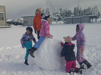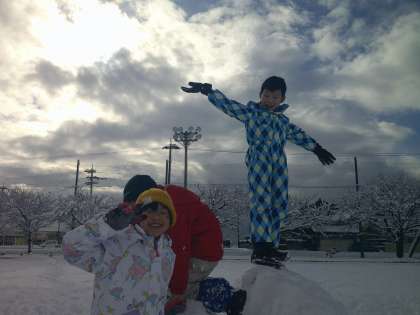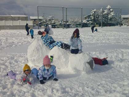 みんなで力を合わせて作った大きな雪玉が重くなりすぎて持ち上げられず、出来たのは寝転がっている雪だるま。それでも、おもしろがって楽しむ子供たちでした。