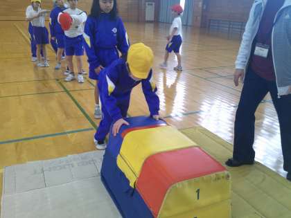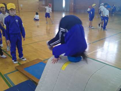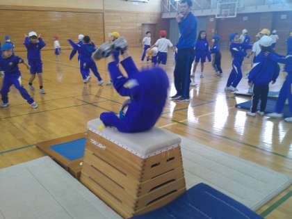 子供たちは、「台上前転」に意欲的に取り組んでいます。一人一人が、自分に合った場を選び、どんどん上達しています。「先生、私、マットもとびばこも苦手だけど、できるようになった」と、女の子が嬉しそうに報告しに来ます。前回まで、補助を必要としていた男の子は、「先生、今日はさわらんでいいよ」とチャレンジ精神いっぱいです。