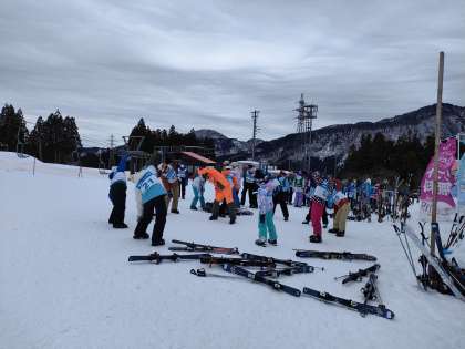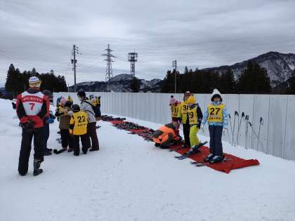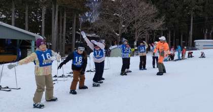 しっかり準備運動をして、実習が始まりました。4年生の初心者も、なだらかな場所で、スキーの着脱を練習しています。心配していたゲレンデの雪も、大丈夫です。けがのないよう、技能に応じた練習を行います。