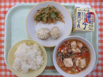 今日の献立は、ごはん、エビパオツ、華風和え、マーボー豆腐、牛乳です。