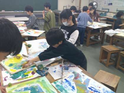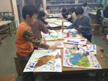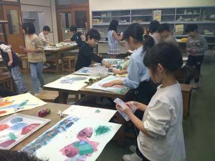 ペットボトルのキャップやレンコン等、身近にある物を使って、表したい感じになるようにスタンピングしました。作品がぐっと楽しく生き生きしました。