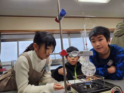 初めて丸底フラスコを使いましたが、手本を見ながら上手に器具を組み立てて実験しました。