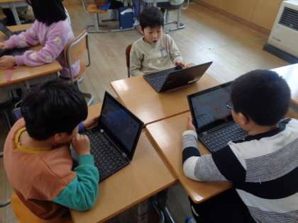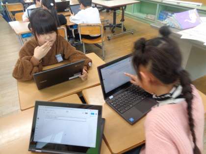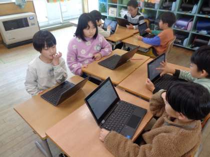 2年生は、クロムブックを使って絵を描きました。班のみんなと協力して作品を完成させていました。上手くいかないことを相談しながら、助け合って真剣に取り組んでいました。