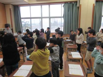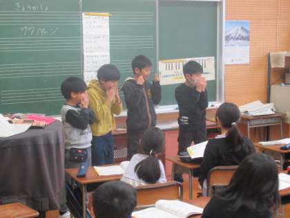 今日の音楽科の学習では、「あたま かた ひざ ぽん」を英語で歌いました。