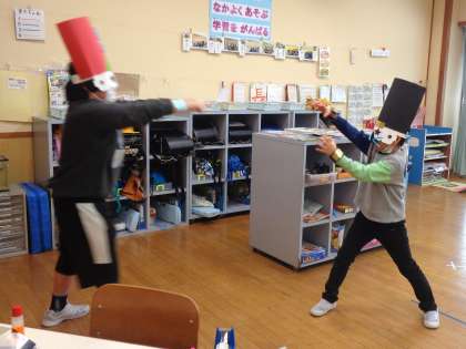 お面をつけて変身し、友達とごっこ遊びもしました。