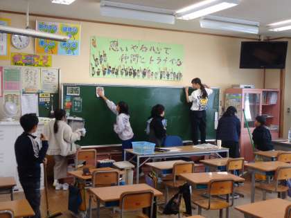 家庭科の学習では、快適な生活を送るためにどのようなことが必要なのか考えています。今日は、教室の中をはたき等を使い隅々まで掃除しました。
