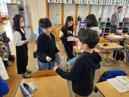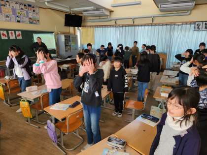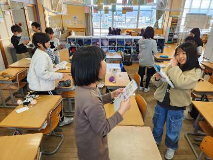 先生の指示通りに体の向きを変えたり、友達の好きな場所を尋ね合ったりして、英語に慣れ親しみました。
