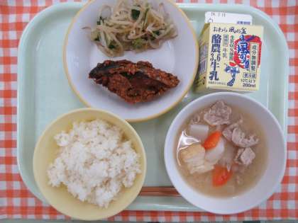 今日の献立は、ごはん、魚の利休揚げ、もやしのおひたし、豚汁、牛乳です。