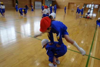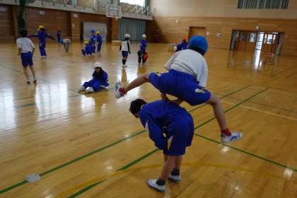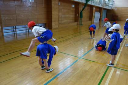 体育科の学習の様子です。跳び箱遊びの前のウォーミングアップです。