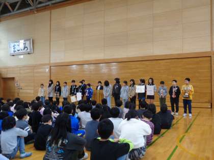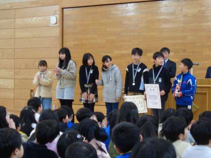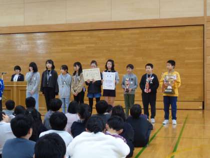 先日行われた、なわとび交流大会の受賞式が行われました。賞状、トロフィー、メダルを照れくさそうに披露しました。学校全体に賞賛してもらえるような他の活動にも取り組めるとよいですね。