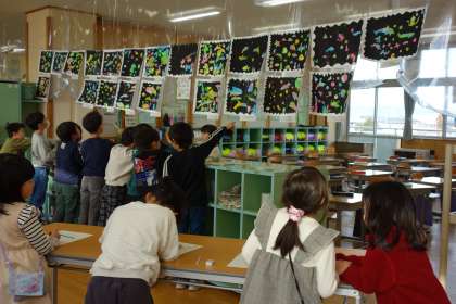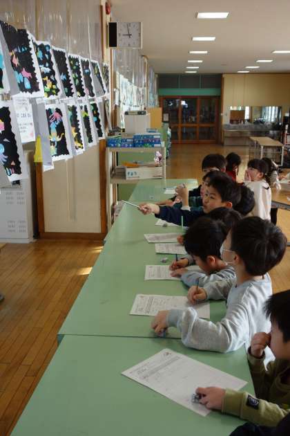 友達の作品の良さに触れました。おもしろい作品が並んでいます。初めての版画でしたが、最後までがんばってつくりましたね。