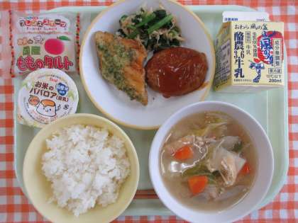 ごはん、(魚の磯辺揚げ・ハンバーグのケチャップ煮)、はりはり和え、具だくさん汁、(もものタルト・みかんババロア)、牛乳です。