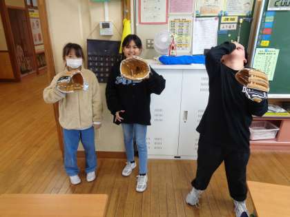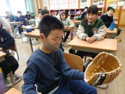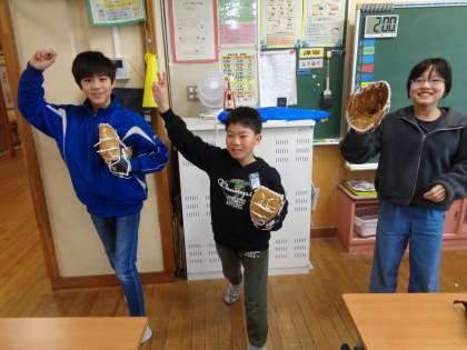 ついに大谷グラブとご対面でした。目を輝かせながら大切そうに扱っていました。触る前に一生懸命手を洗っている児童もいました。グローブのはめ方を知らない児童もいたため、とても貴重な経験になりました。「軽い」「やわらかい」など色んな感想を述べていました。