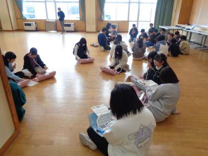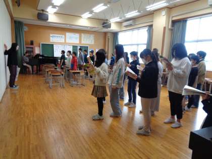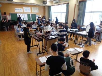学年で合同音楽をしました。「旅立ちの日に」を歌ったり、「キセキ」の合奏練習をしたりしました。一クラスで行うよりも、やはり全員で歌ったり演奏したりすると迫力があります。