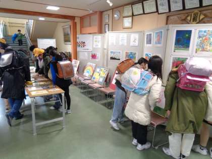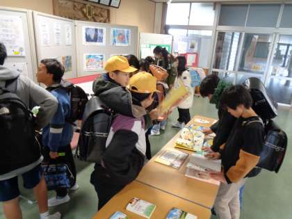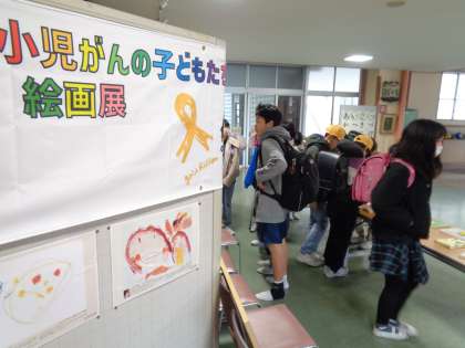 下校前、玄関ホールでたくさんの子供たちが立ち止まっていました。全国各地で病気と闘う子供たちの絵や本に釘付けです。何を思い、何を考えていたのでしょうか。一人一人の眼差しはとても真剣でした。