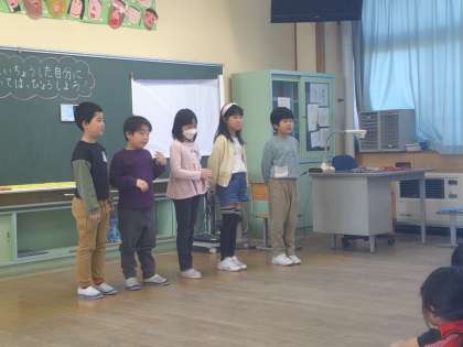 今日は、今までの成長についてみんなの前で発表しました。自分が頑張ってきたことに自信をもって発表する姿見られました。