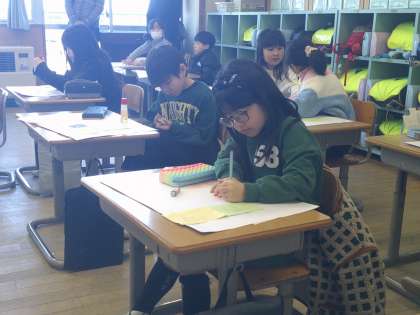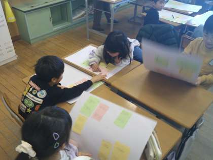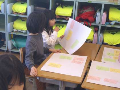 本日は、子供たちの様子をご参観いただきありがとうございました。1年2組では、生活科「1年生をふりかえろう」の学習を行いました。1年生になっていろいろなことができるようになったことに気付いた子供たち。できるようになったことをカードに書いてグループで紹介し合いました。