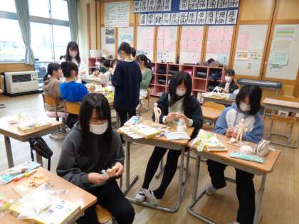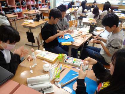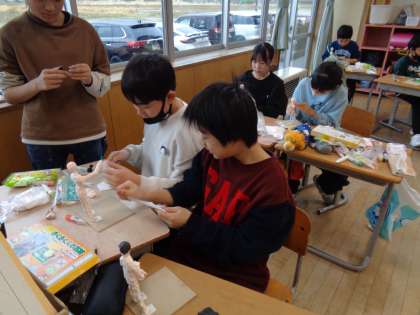 図画工作の学習で「未来のわたし」を作っています。未来の自分を想像して、紙粘土で表現していくものです。芯となる部分を紙粘土で覆いながら形作っていきます。