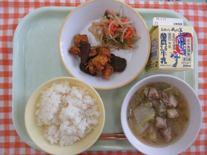 今日の献立は、ごはん、豚肉とレバーのカレー風味、ナムル、たら汁、牛乳です。