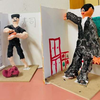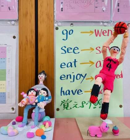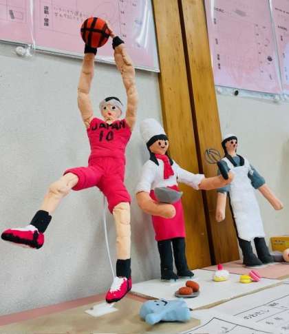未来のある日の自分の姿を想像してつくっています。次第に完成品が教室に並びはじめました。