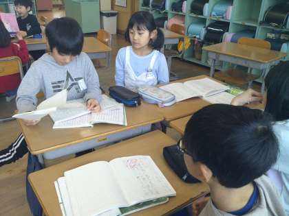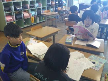 お話を読んで、心にのこったところとそのわけを、グループの友達と交流しました。