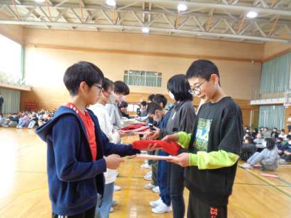 1年間、全校の前に立ち、進めてきた児童会活動を5年生に引き継ぎました。ファイルや団旗等を渡すときには、「今までありがとう。これからがんばってね。」と声をかけていました。思いも受け継がれていきます。