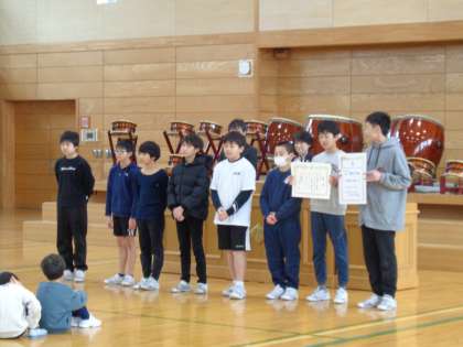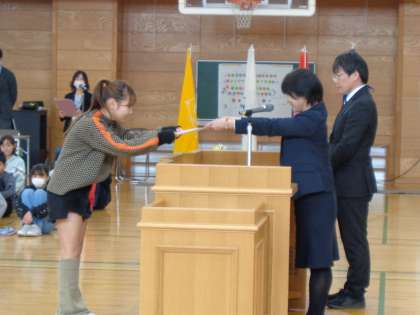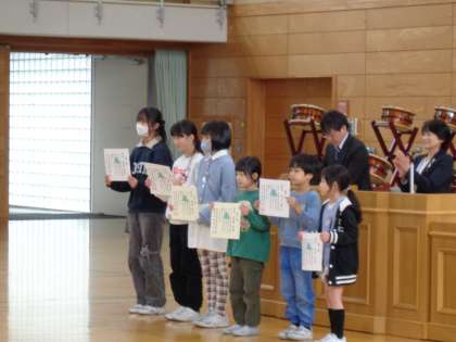 児童会引継式の後、授賞式が行われました。6年生は、富山市小学生なわとび交流大会、富山市小学生ミニバスケットボール交流会、富山県書初大会、校内書初大会、1月の家庭学習週間で授賞を受けました。それぞれの活躍を全校で讃えました。