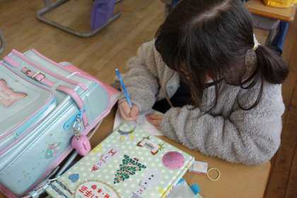 本を読んだ後は、図書委員会の児童が届けてくれた「おはなしカード」を書いていました。図書委員に提出すると、読書おみくじができるそうです。楽しみです。