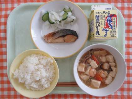 今日の献立は、ごはん、ふくらぎの西京焼き、かぶのサラダ、えびと豆腐のうま煮、牛乳です。