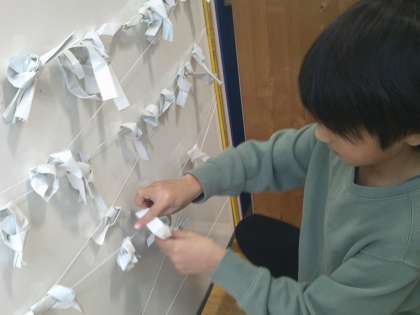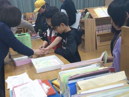 読んだ本の感想をカードに書いて図書室へ持っていくと、おみくじがひけるという図書委員会さんの企画に、楽しく参加している2年生。大吉をひいて、お気に入りのイラストが描かれたしおりをもらって嬉しそうでした。