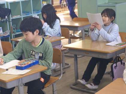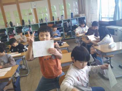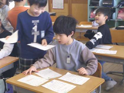 友達のよいと思うところや、すごいと思うところをカードに書いて送り合いました。どの子供の表情も嬉しそうでした。