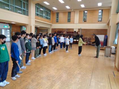 6年間指導してくださった先生に、感謝の気持ちを伝えました。「和太鼓演奏で経験した、周りの音をよく聴き、みんなで心を一つにすることを生かして、中学校に行ってもみんなと協力することを大切にしてほしい」とメッセージをいただきました。子供たちは「頑張ります!」と伝えました。